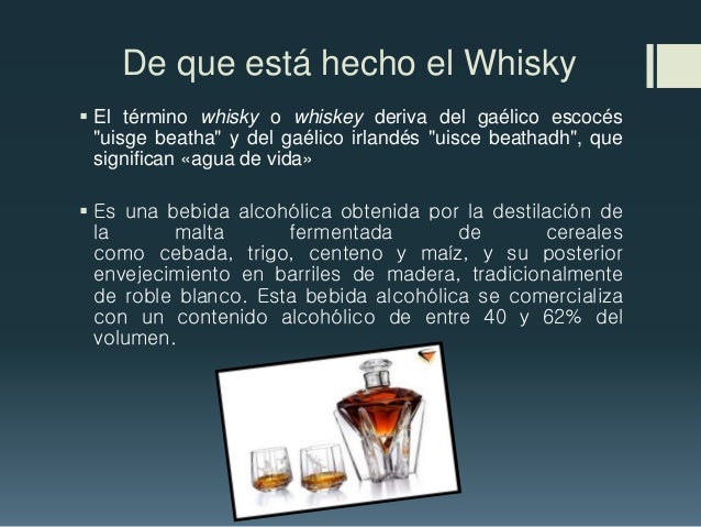 Es una bebida espirituosa que contiene alcohol elaborada a base de agua un cereal y levadura. El maíz es el segundo ingrediente más utilizado en la elaboración de whisky. Por ejemplo el whisky elaborado en Escocia conocido como Scotch Whisky es inimitable debido a que solamente escocia dispone de aguas de deshielos que provienen de.